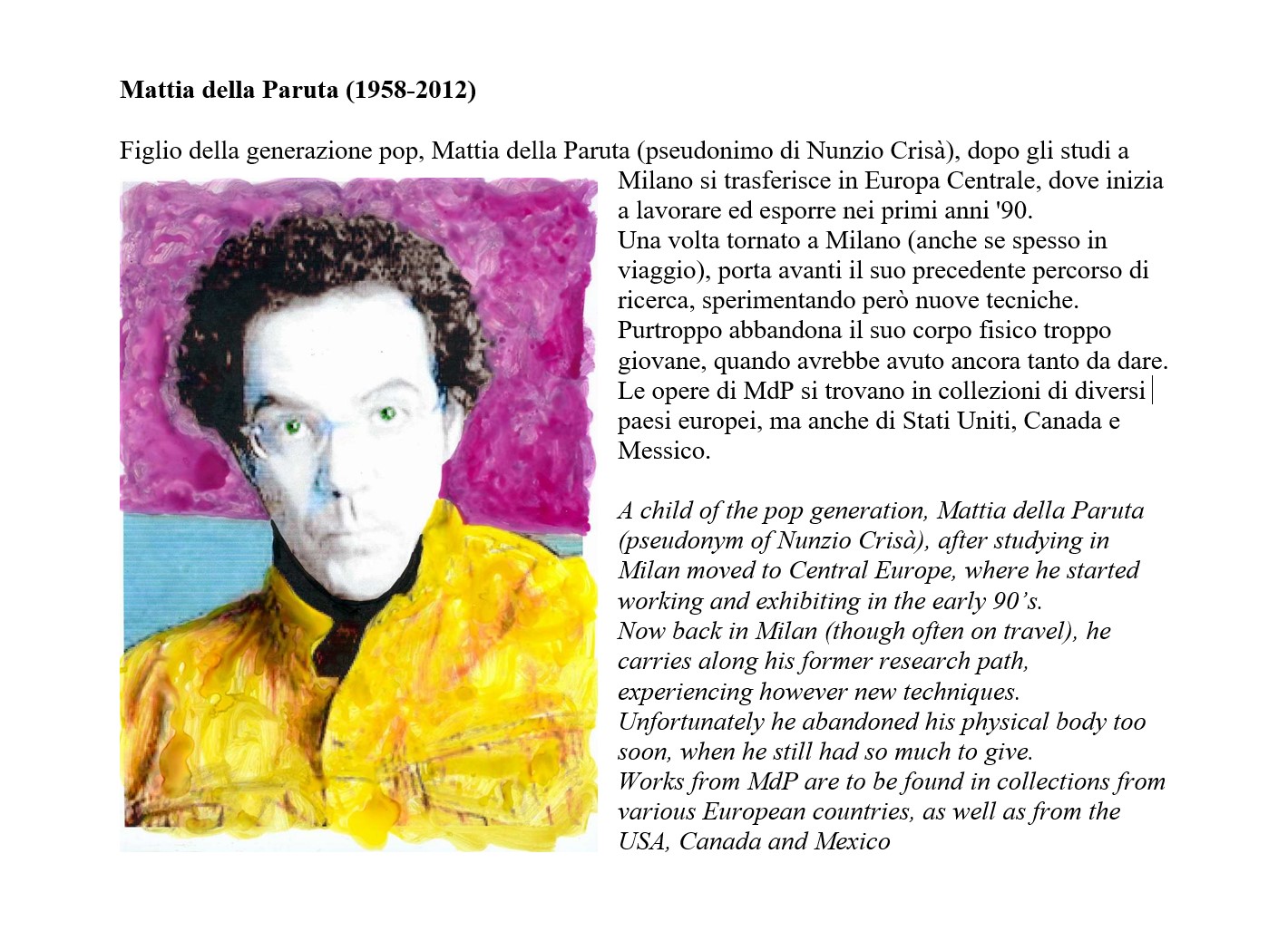 Figlio della generazione pop, Mattia della Paruta (pseudonimo di Nunzio Crisà), dopo gli studi a Milano si trasferisce in Europa Centrale, dove inizia a lavorare ed esporre all'inizio degli anni '90.