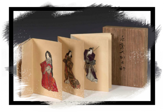 Raro LibroEpoca Meiji, circa 1880, 25x18cmoggetto assolutamente fuori dal comune, e probabilmente coevo delle bambole oshi.È composto da 13 figure aventi testa, mani, piedi e contorni dipinti a mano, mentre i motivi di riempimento provengono da antiche sete opportunamente tagliate, piegate ed accostate tra loro. Il risultato è affascinante.Le figure così ottenute sono poi state incollate su di un libro conservato nella sua scatola originale in legno dipinto.