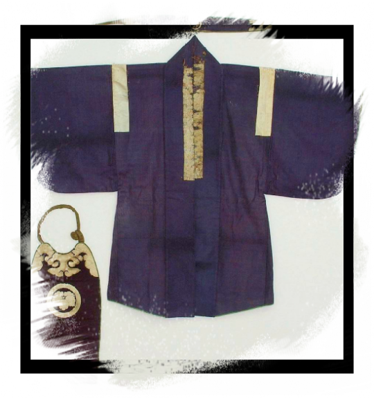Giappone, periodo Edo (1603–1867), cm 91x129.E' appartenuto probabilmente a un samurai che viveva nella parte settentrionale del Giappone in quanto il set è realizzato in lana (un materiale molto costoso perché doveva essere importato) rivestito con un broccato di seta finissima, e con lo stemma di famiglia (komon) e altri ornamenti in taglio di seta, applicati e ricamati. Il colore purpureo era un altro segno di status sociale del proprietario.Il finissimo e dettagliato design dei punti fodera in seta permettono di attribuirlo tra il tardo 18° e l'inizio del 19° secolo (col Meiji i samurai persero il loro status e gli onori). Purtroppo, la condizione è tutt'altro che intatta con sfilacciamenti, usura, alcune macchie e in aggiunta vecchi danni da tarme sul panno di lana.Inoltre, il colore della pettorina è un tono più scuro del viola di giacca e fascia; tuttavia utilizza lo stesso broccato di seta per delineare i dettagli, quindi deve appartenere a questo insieme comunque.